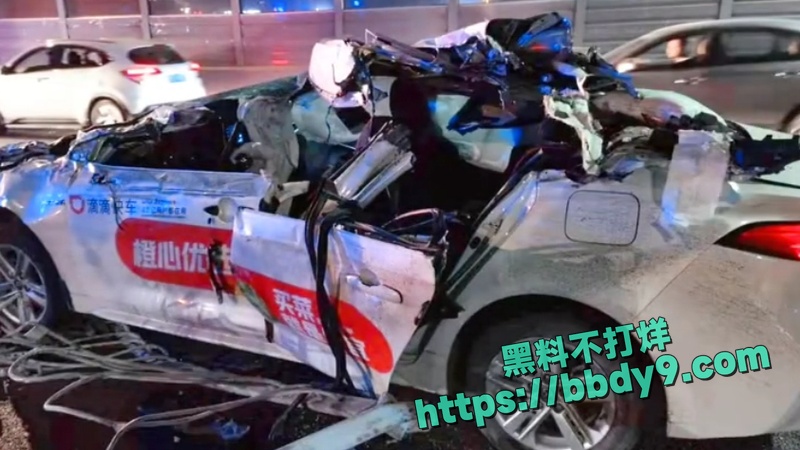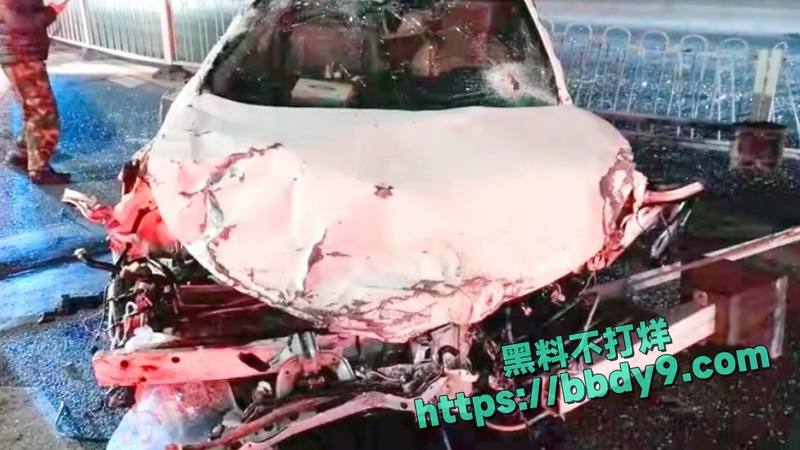 车辆前脸严重变形、引擎盖掀起、零件散落一地;女子倒地后无生命体征,头部及身体有明显伤痕。现场有围观群众、碎片及护栏损坏痕迹。