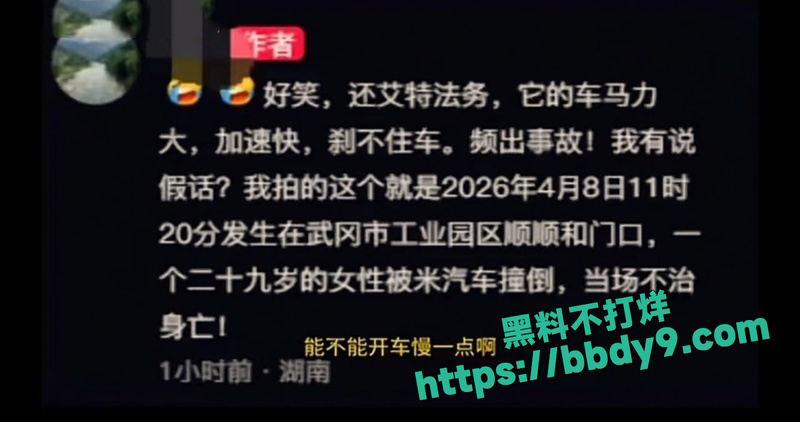 2026年4月8日11时20分左右,湖南省邵阳市武冈市工业园区顺顺和门口发生一起严重交通事故。一名29岁女性被一辆米系品牌汽车(疑似小米SU7或类似车型)撞倒,当场不治身亡。事故现场惨烈,车辆严重损毁,女子遗体倒在路中央,引发大量网友围观和讨论。