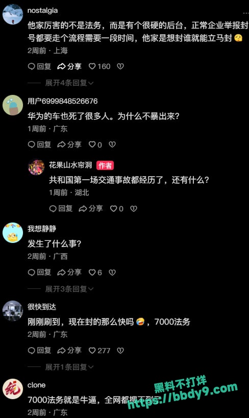部分人质疑事故细节,如“车速过快”“刹不住车”“马力太大”,还有人讨论“7000法务”(疑似指小米汽车相关争议)是否会介入。